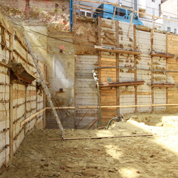 Pour répondre à la demande de mise à profit maximale de la parcelle, CVR a travaillé pour la reprise en sous-œuvre du mur mitoyen au moyen d’une fouille blindée.
