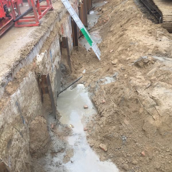 Onderschoeien van bestaande funderingen van de aanpalende gebouwen door middel van beschoeide sleuven tot op een diepte van 3,35 m (grondkering 1,05 tot 2,85 m).